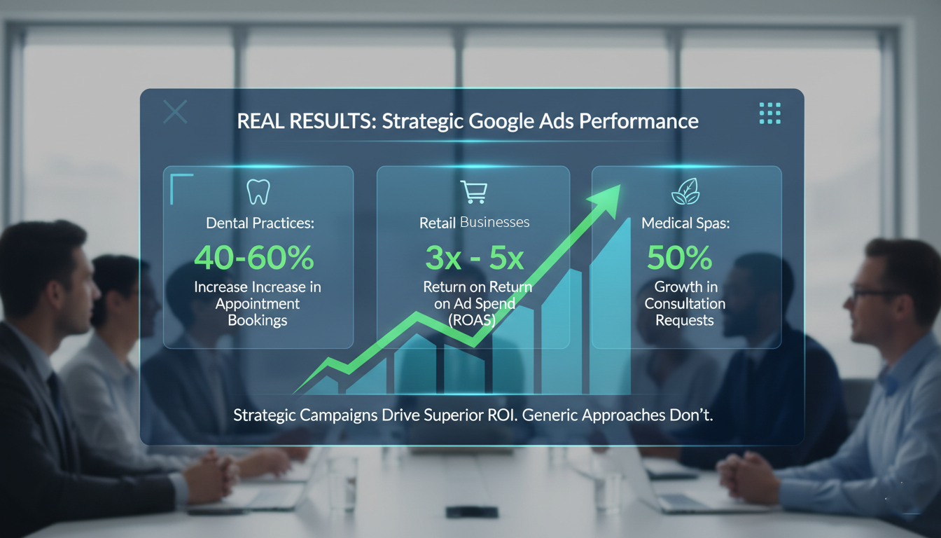 Our dental practice clients typically see 40% to 60% increases in appointment bookings within the first 90 days. Retail businesses report 3x to 5x return on ad spend. Medical spas experience 50% growth in consultation requests.