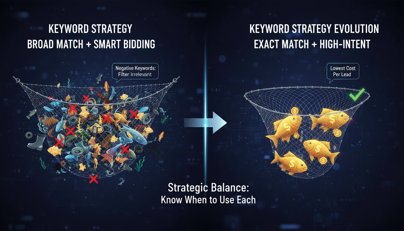 For niche markets like dental practices or specialized retail, exact match keywords for branded terms and high-intent searches still deliver the lowest cost per lead. The strategy isn't choosing between exact and broad match. It's knowing when to use each.
